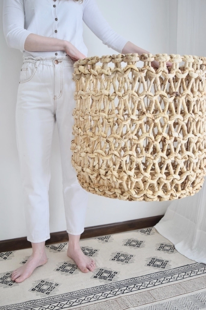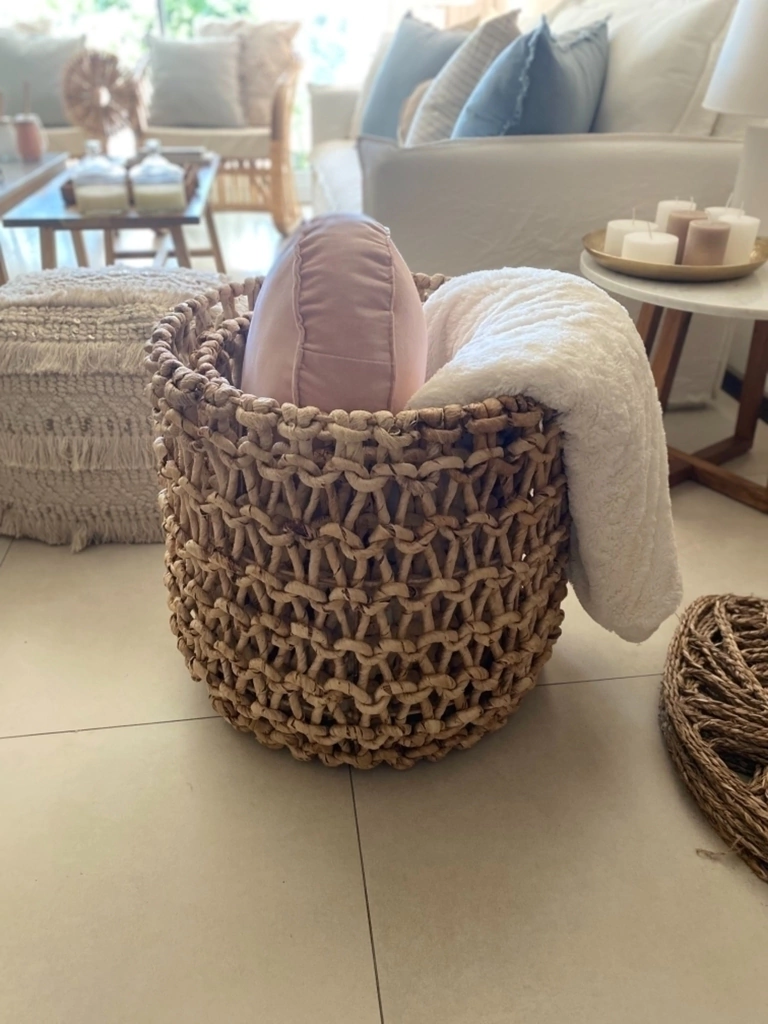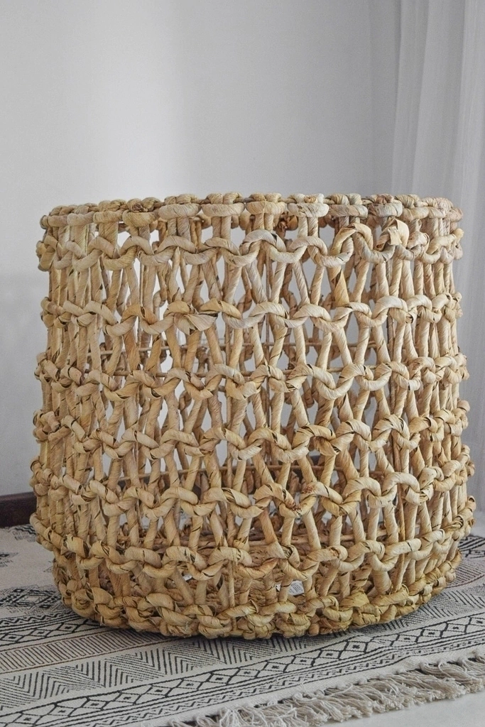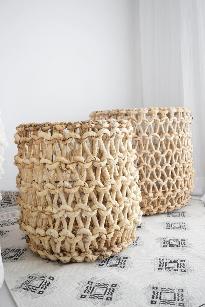 Este canasto de alambre revestido en hojas de rattan mojado, importado directamente de Vietnam, es ideal para organizar con estilo. Disponible en dos tamaños: