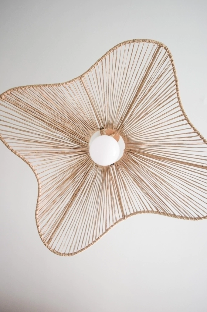 La Lámpara de techo Suir está elaborada artesanalmente, con una estructura de hierro tejida con hilo Kraft que aporta un toque único a tu decoración.