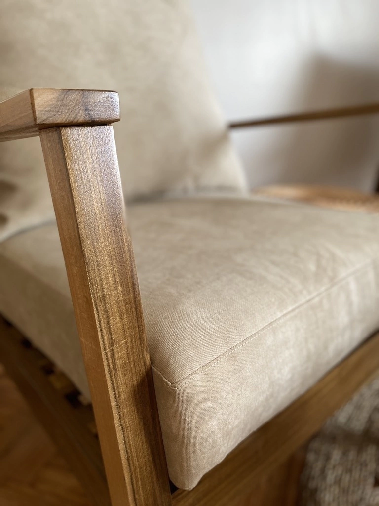 El Sillón Doreen por encargo combina elegancia y comodidad en un diseño de madera petiribi macizo, ideal para ambientes sofisticados. Sus almohadones en pana color visón, con cierres desmontables, permiten personalizar el estilo y facilitar su limpieza. Los almohadones se pueden tapizar en diferentes colores de pana (consultar disponibilidad).